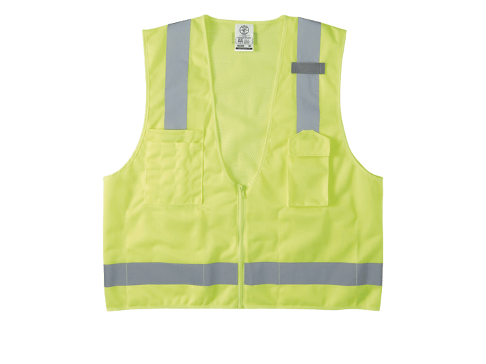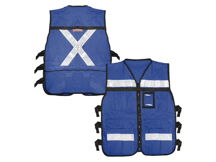 High-visibility reflective safety vest, medium/large. With multiple pockets of different capacities.